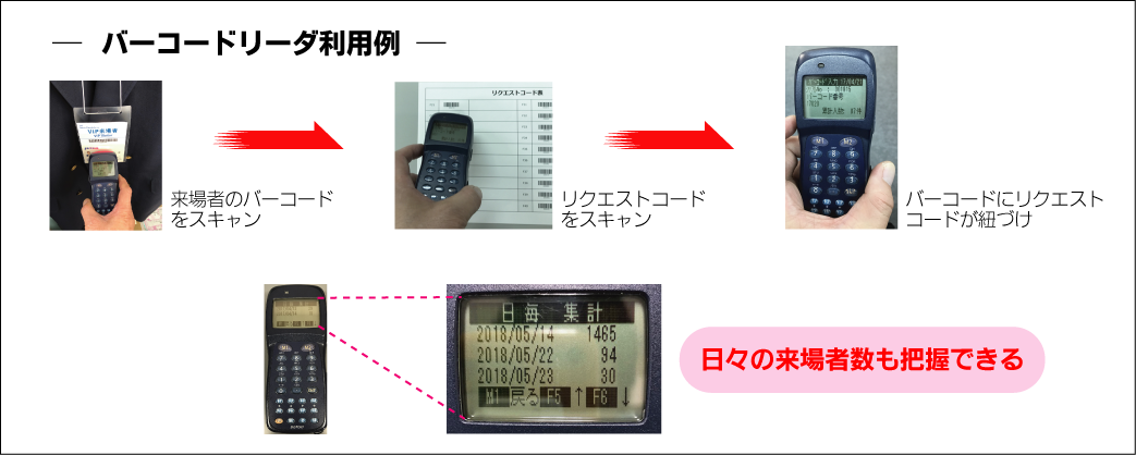展示会・イベントで来場者が着用している来場者バッジのQRコードを専用のリーダでスキャンすることで、名刺情報・アンケート情報をExcel等のファイルで受け取れるサービスです。